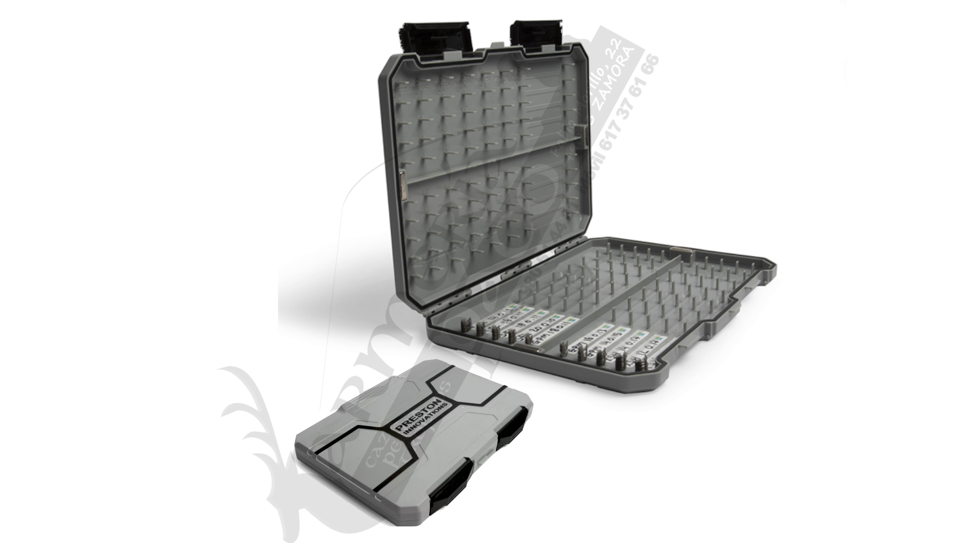 La capacidad es enorme, ya que la caja cuenta con clavijas largas que pueden sujetar hasta 20 anzuelos. Hay 20 posiciones disponibles para los bajos de anzuelo más largos de hasta 9" y 40 posiciones si los bajos de anzuelo son de 3 o 4" de largo, lo que significa que se pueden almacenar hasta 800 bajos de anzuelo de 3 o 4".
